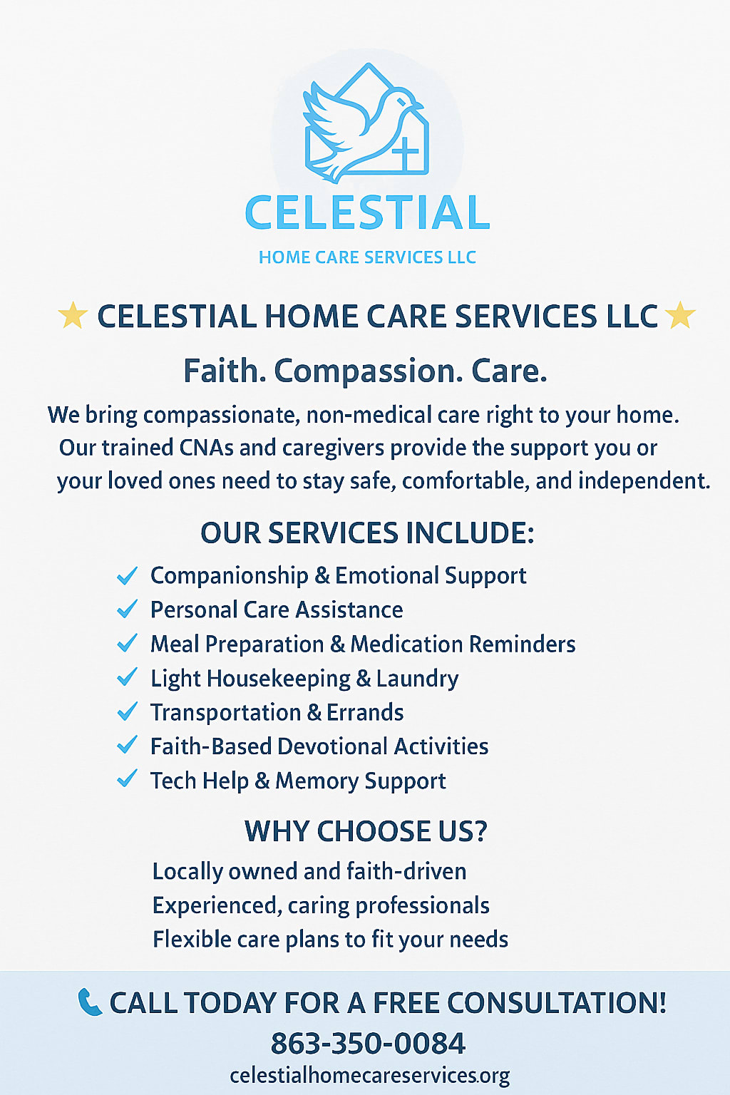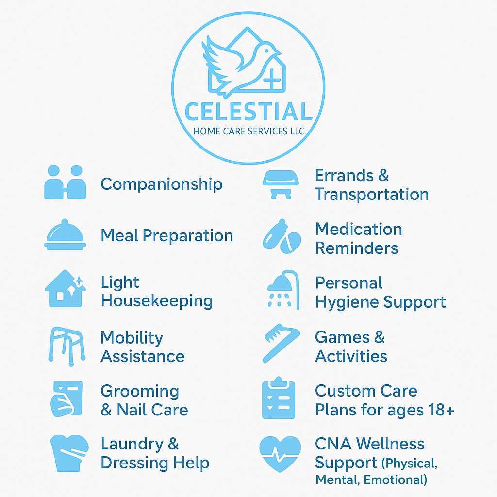 Celestial Home Care Services LLC is an affordable, family-owned, faith-driven, non-medical home care agency dedicated to uplifting the lives of seniors and individuals in need throughout Central Florida. Founded on the principles of compassion, dignity, and trust, we provide personalized in-home support that honors the whole person—body, mind, and spirit. We are AHCA Accredited and Certified. All caregivers are carefully selected, trained, and insured, and undergo thorough background checks to provide excellent companionship, personal care, and assistance with daily activities. Celestial Home Care Services LLC
