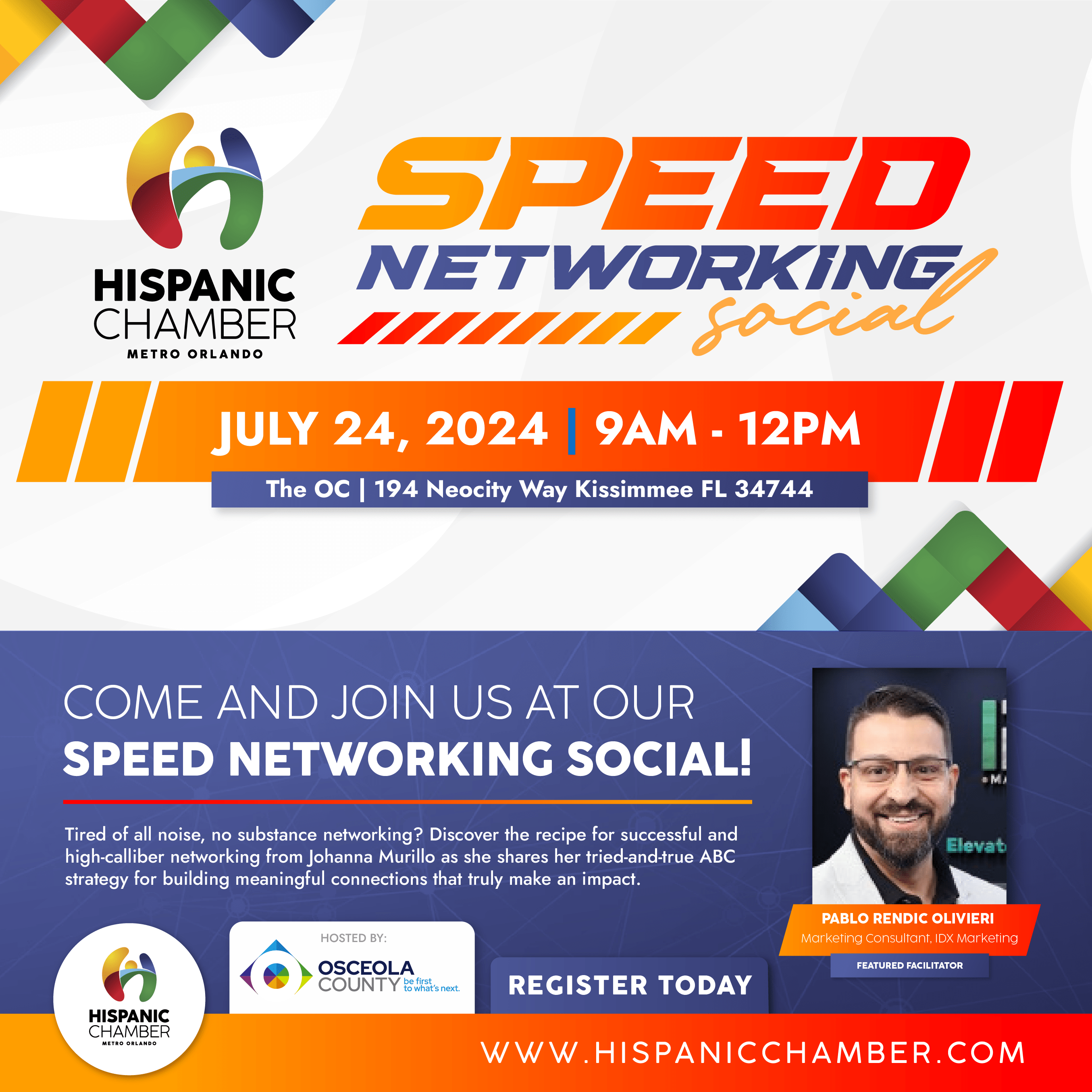 Come and join us at our first Speed Networking Social in Osceola! Learn how to create professional relationships and continue to grow your contact lists. We will provide you with the insight and tools to intentionally connect with others, present yourself with authority, and network. During the Speed Networking Social, we will have a speed round covering the following topics: - Networking 101 - - Business Capability Statement - How to create a powerful Business Capability Statement Members: Free of charge Non-members: $15 per person 3rd floor from 9:00am to 12:00pmHispanic Chamber Speed Networking - Osceola